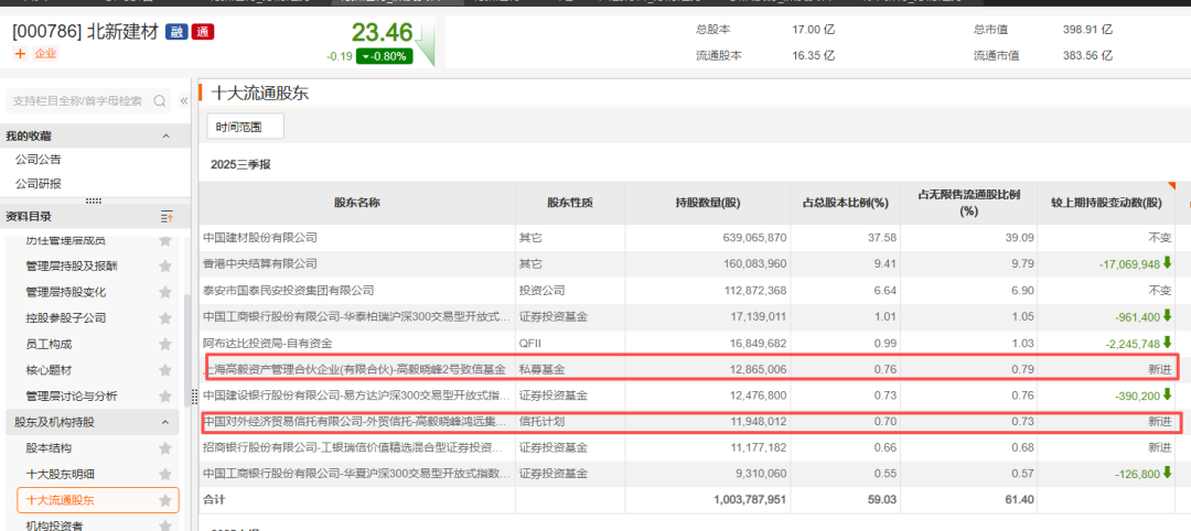 北新建材近日发布的三季报显示,截至三季度末,邓晓峰管理的高毅晓峰2号致信基金和外贸信托-高毅晓峰鸿远集合资金信托计划新进该公司前十大流通股东名单,持股数量分别为1286.5万股和1194.8万股,期末合计持股市值达5.33亿元。