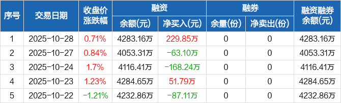 融资方面,当日融资买入814.56万元,融资偿还584.72万元,融资净买入229.85万元。融券方面,融券卖出0份,融券偿还0份,融券余量0份,融券余额0元。融资融券余额合计4283.16万元。