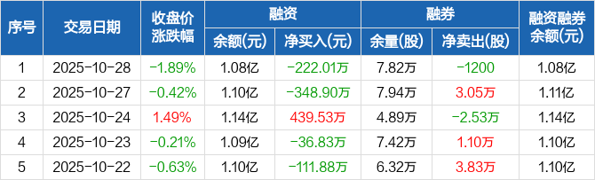 融资方面,当日融资买入549.67万元,融资偿还771.68万元,融资净偿还222.01万元。融券方面,融券卖出0股,融券偿还1200股,融券余量7.82万股,融券余额36.44万元。融资融券余额合计1.08亿元。