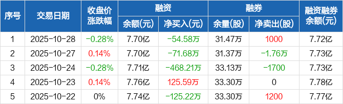 一汽解放融资融券信息显示,2025年10月28日融资净偿还54.58万元;融资余额7.7亿元,较前一日下降0.07%。