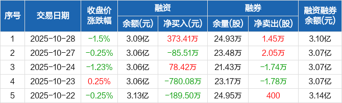 融资方面,当日融资买入2540.75万元,融资偿还2167.34万元,融资净买入373.41万元。融券方面,融券卖出1.46万股,融券偿还100股,融券余量24.93万股,融券余额98.22万元。融资融券余额合计3.1亿元。