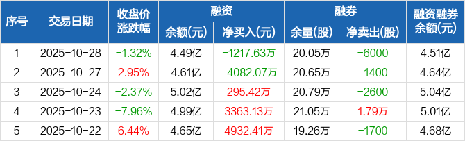 融资方面,当日融资买入9011.78万元,融资偿还1.02亿元,融资净偿还1217.63万元。融券方面,融券卖出1900股,融券偿还7900股,融券余量20.05万股,融券余额269.07万元。融资融券余额合计4.51亿元。