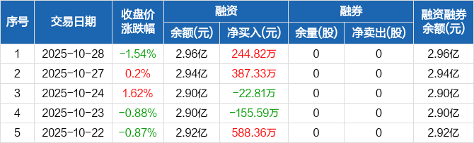 融资方面,当日融资买入2900.56万元,融资偿还2655.74万元,融资净买入244.82万元。融券方面,融券卖出0股,融券偿还0股,融券余量0股,融券余额0元。融资融券余额合计2.96亿元。
