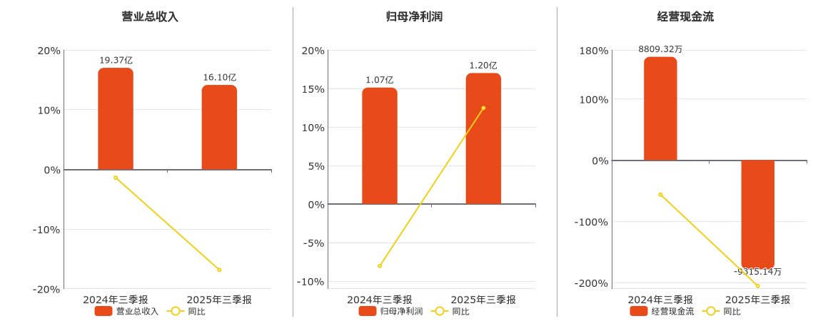 公司营业总收入为16.10亿元,较去年同报告期营业总收入减少3.27亿元,同比较去年同期下降16.86%。归母净利润为1.20亿元,在已披露的同业公司中排名第10。经营活动现金净流入为-9315.14万元,在已披露的同业公司中排名第15,较去年同报告期经营活动现金净流入减少1.81亿元,同比较去年同期下降205.74%。
