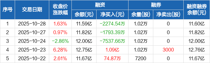 融资方面,当日融资买入1.46亿元,融资偿还1.68亿元,融资净偿还2274.54万元,连续3日净偿还累计1.16亿元。融券方面,融券卖出0股,融券偿还0股,融券余量1.02万股,融券余额28.04万元。融资融券余额合计11.6亿元。