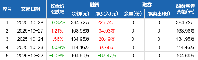 融资方面,当日融资买入296.6万元,融资偿还70.86万元,融资净买入225.74万元,连续4日净买入累计290.03万元。融券方面,融券卖出0份,融券偿还0份,融券余量0份,融券余额0元。融资融券余额合计394.72万元。