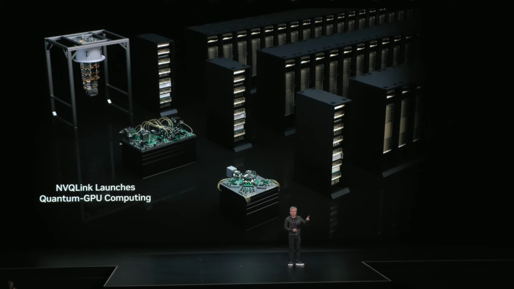 黄仁勋宣布,公司与数十家相关企业以及美国国家实验室展开合作,正式发布用于量子计算的NVQLink互联系统。据介绍,这项技术可在量子处理器与AI超级计算机之间实现高速通信,成为“连接量子与经典计算的罗塞塔石碑(破译古埃及文字的关键文物)”。