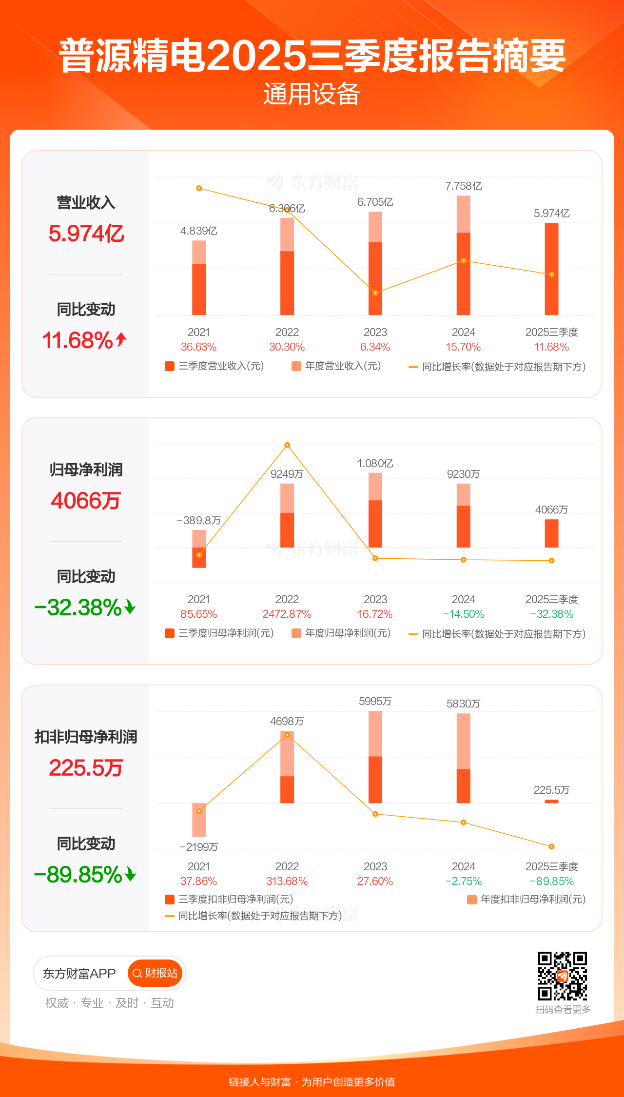 普源精电10月28日发布2025年三季报显示,公司前三季实现营业收入5.97亿元,同比增长11.68%;归母净利润4066.13万元,同比下滑32.38%;扣非归母净利润225.51万元,同比下滑89.85%。