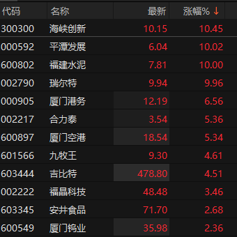 上证报中国证券网讯 10月29日早盘,福建本地股表现活跃,截至9时31分,平潭发展5连板,福建水泥3连板,瑞尔特2连板,海峡创新涨超10%,厦门港务、合力泰等纷纷走高。