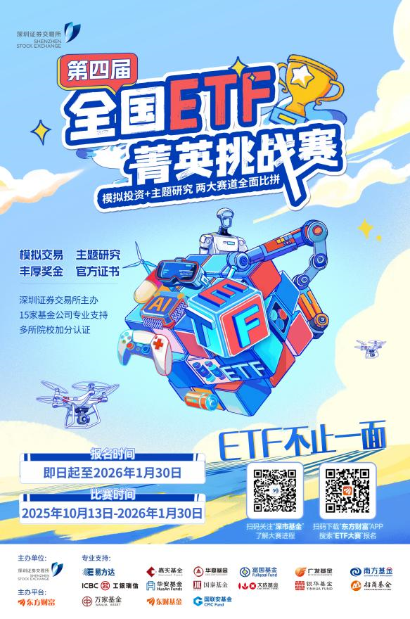目前,第四届全国ETF菁英挑战赛已正式进入比赛阶段,报名通道同步全面开放。即日起至2026年1月30日,参赛者可通过东方财富APP或“东方财富金融素养”微信公众号报名。大赛设有ETF模拟投资、ETF研究两大核心赛道,既为学生提供理论实践平台,也为社会投资者搭建技能提升渠道,实现对不同背景参与者的精准覆盖。
