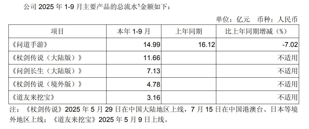 新上线的两个版本的《杖剑传说》游戏合计为前三季度贡献超16亿元流水,1月公测的《问剑长生(大陆版)》贡献超7亿元,《道友来挖宝》贡献收入超3亿元,今年上线的新游戏总计贡献了超26亿元的流水。