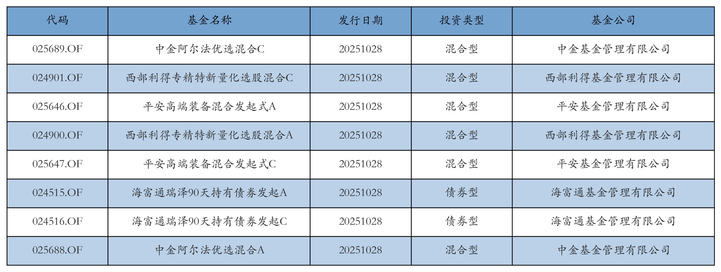 昨日有8只新基金发行,分别为:中金阿尔法优选混合C、西部利得专精特新量化选股混合C、平安高端装备混合发起式A、西部利得专精特新量化选股混合A、平安高端装备混合发起式C、海富通瑞泽90天持有债券发起A、海富通瑞泽90天持有债券发起C、中金阿尔法优选混合A,详情见下表: