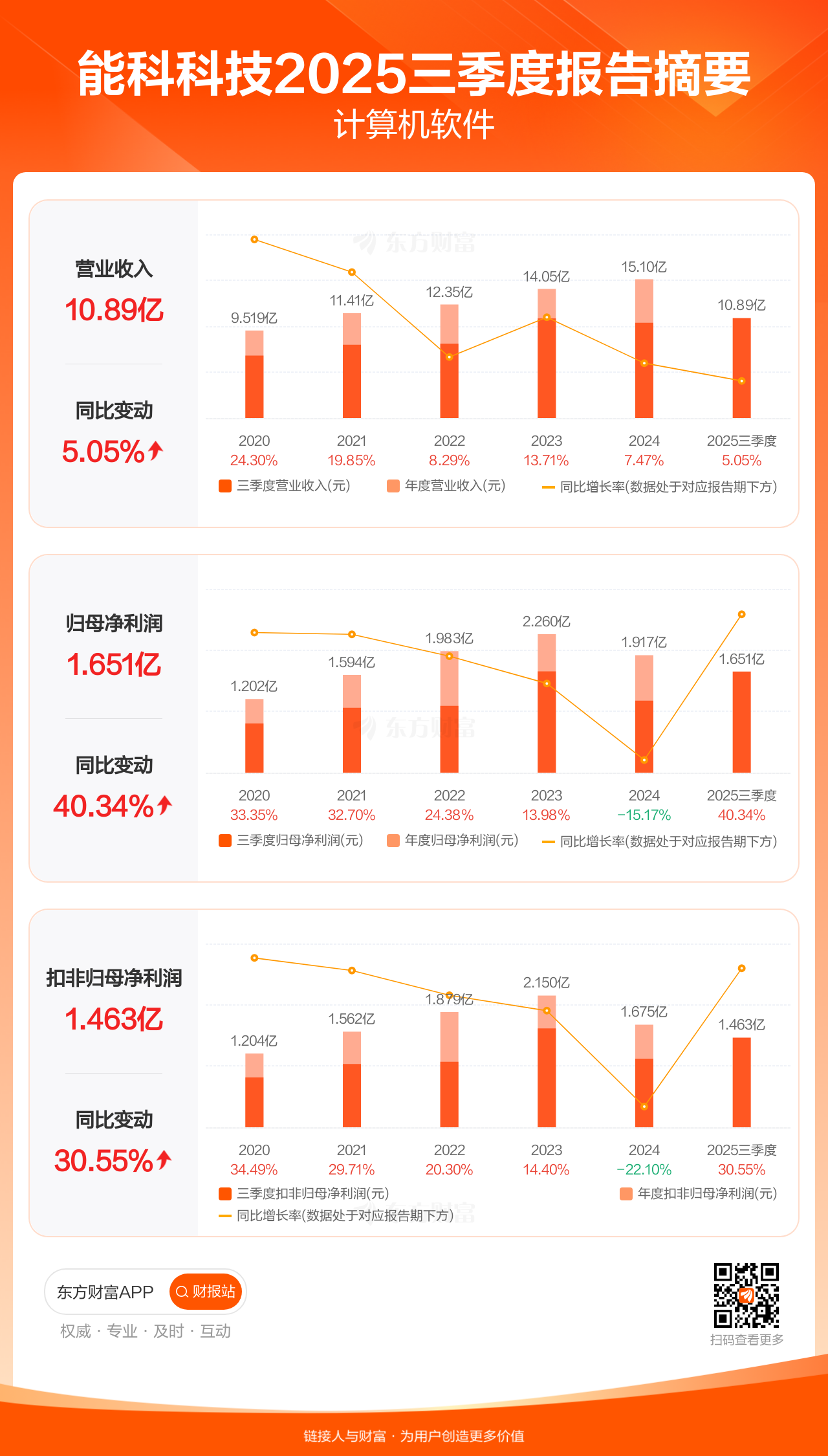 能科科技10月28日发布2025年三季报显示,公司前三季实现营业收入10.89亿元,同比增长5.05%;归母净利润1.65亿元,同比增长40.34%;扣非归母净利润1.46亿元,同比增长30.55%。