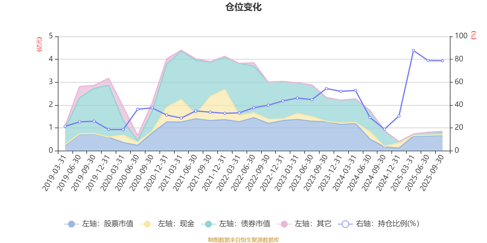 据定期报告数据统计,近三年平均股票仓位为51.48%,同类平均为72.35%。2025年一季度末基金达到87.7%的最高仓位,2020年一季度末最低,为18.61%。