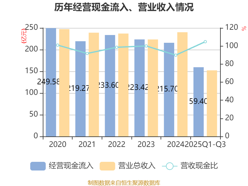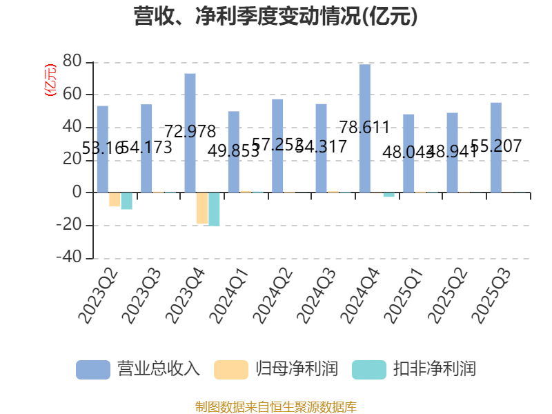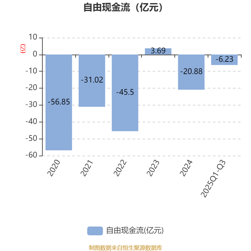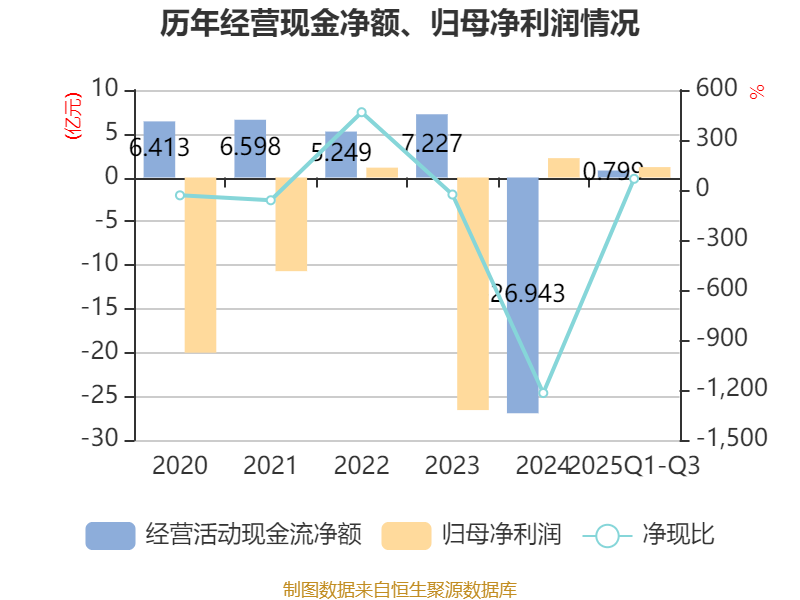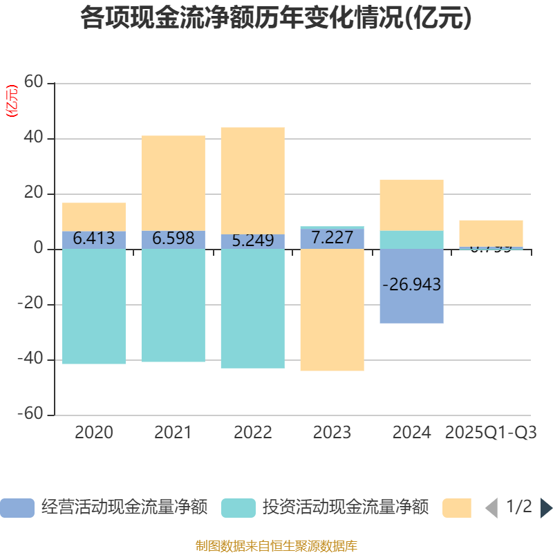 2025年前三季度,公司经营活动现金流净额为7986.6万元,同比增加21.68亿元;筹资活动现金流净额9.49亿元,同比减少8.96亿元;投资活动现金流净额-4258.4万元,上年同期为6.94亿元。