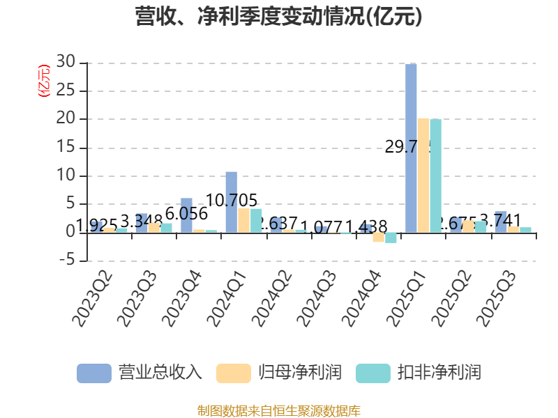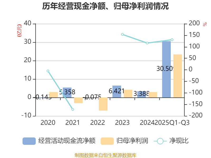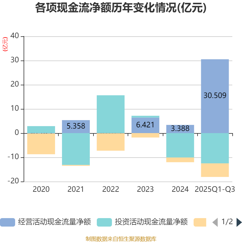 2025年前三季度,公司经营活动现金流净额为30.51亿元,同比增长377.65%;筹资活动现金流净额-5.61亿元,同比减少3.68亿元;投资活动现金流净额-12.51亿元,上年同期为-9.3亿元。