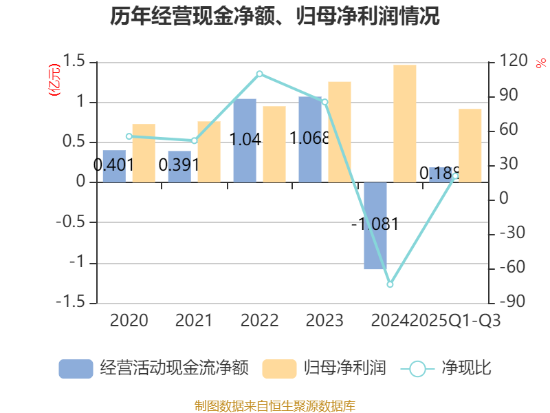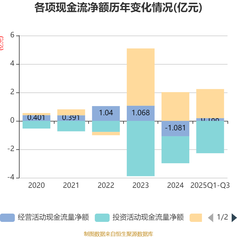 2025年前三季度,公司经营活动现金流净额为1881.63万元,同比下降18.48%;筹资活动现金流净额2.05亿元,同比增加9723.77万元;投资活动现金流净额-2.27亿元,上年同期为-2.2亿元。
