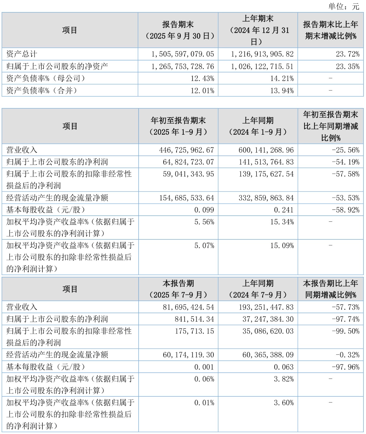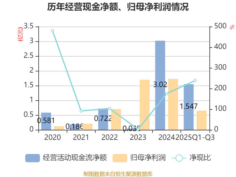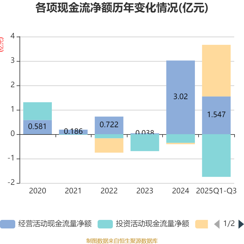 2025年前三季度,公司经营活动现金流净额为1.55亿元,同比下降53.53%;筹资活动现金流净额2.12亿元,同比增加2.14亿元;投资活动现金流净额-1.75亿元,上年同期为-540.53万元。