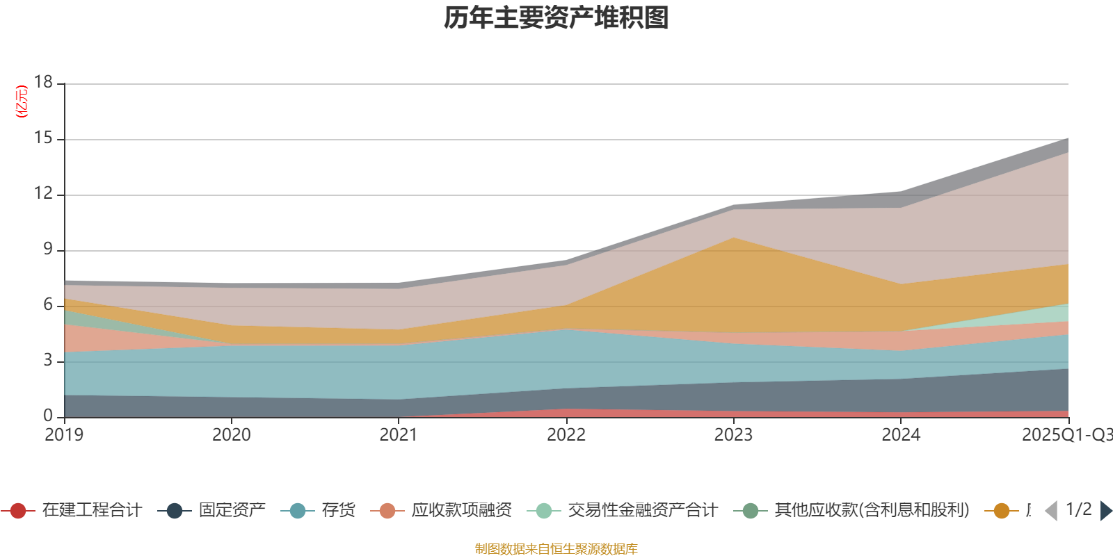 资产重大变化方面,截至2025年三季度末,公司应收票据及应收账款较上年末减少16.28%,占公司总资产比重下降6.74个百分点;交易性金融资产合计占公司总资产的6.36%,上年末为0;货币资金较上年末增加46.53%,占公司总资产比重上升6.24个百分点;应收款项融资较上年末减少32.71%,占公司总资产比重下降3.97个百分点。