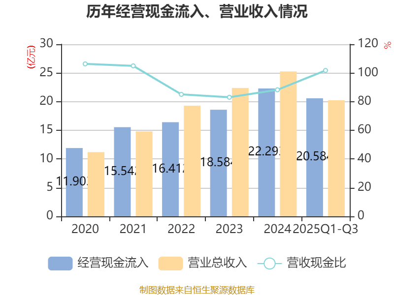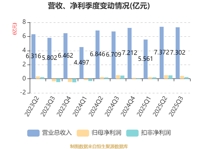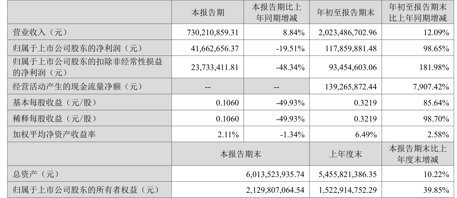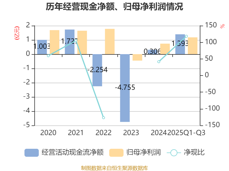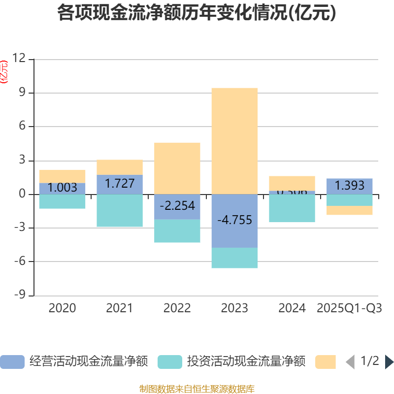2025年前三季度,公司经营活动现金流净额为1.39亿元,同比增长7907.42%;筹资活动现金流净额-7956.31万元,同比减少1.77亿元;投资活动现金流净额-1.04亿元,上年同期为-2.35亿元。
