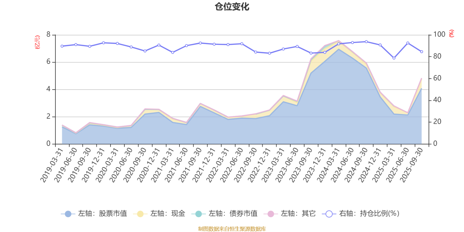 据定期报告数据统计,近三年平均股票仓位为87.62%,同类平均为88.27%。2024年三季度末基金达到93.71%的最高仓位,2025年一季度末最低,为78.68%。
