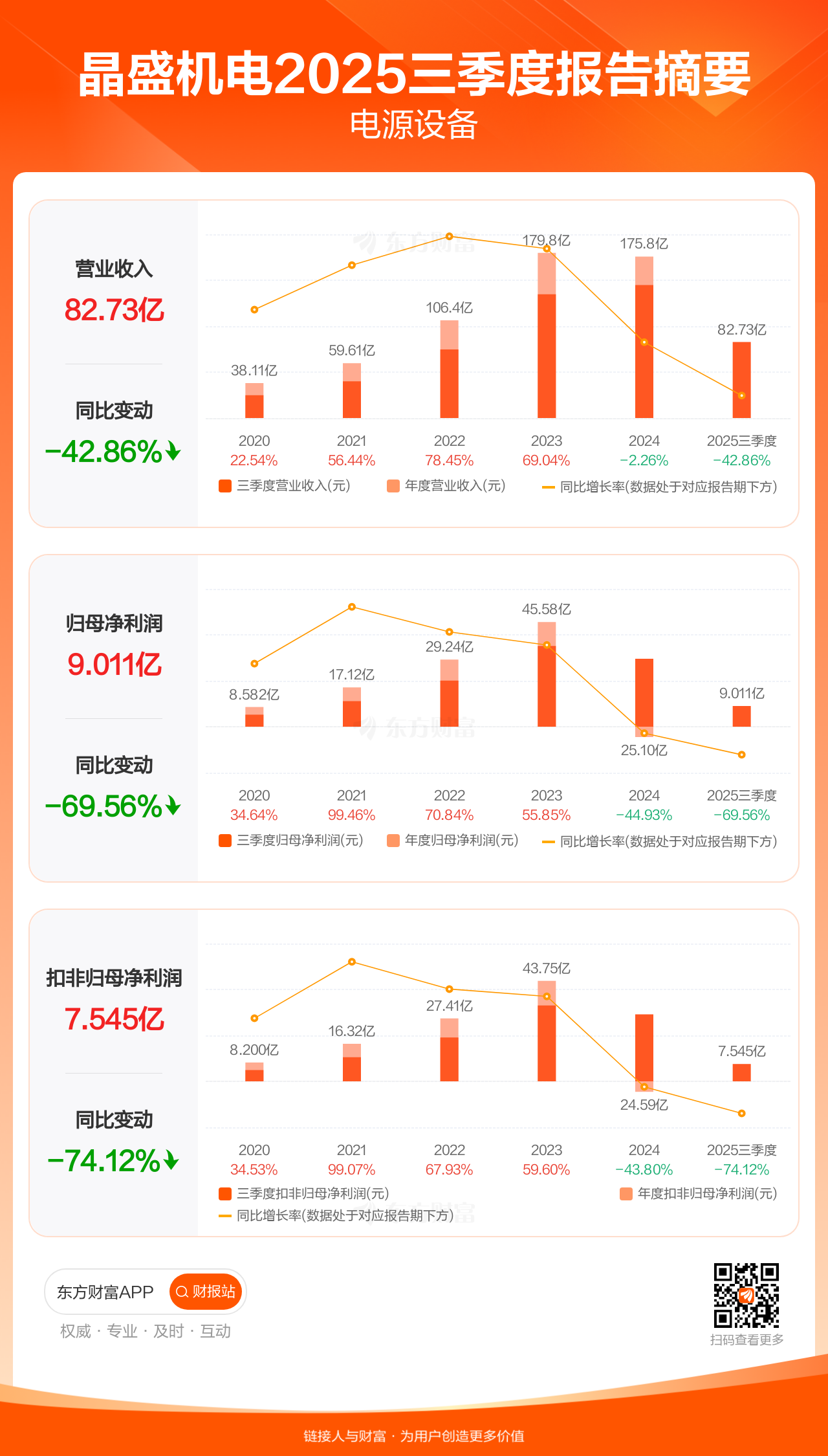 晶盛机电10月25日发布2025年三季报显示,公司前三季实现营业收入82.73亿元,同比下滑42.86%;归母净利润9.01亿元,同比下滑69.56%;扣非归母净利润7.55亿元,同比下滑74.12%。