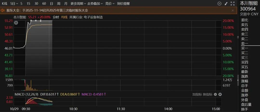 盘初6G概念异动,本川智能(300964)直线拉升“20cm”涨停。