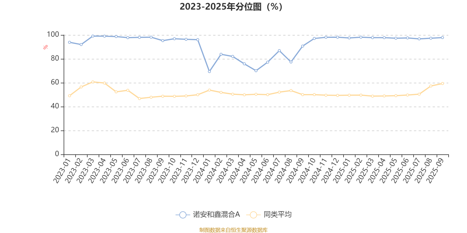 通过所选区间该基金净值增长率分位图,可以观察该基金与同类基金业绩比较情况。图为坐标原点到区间内某时点的净值增长率在同类基金中的分位数。