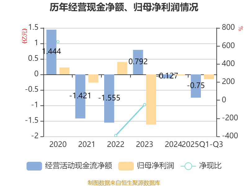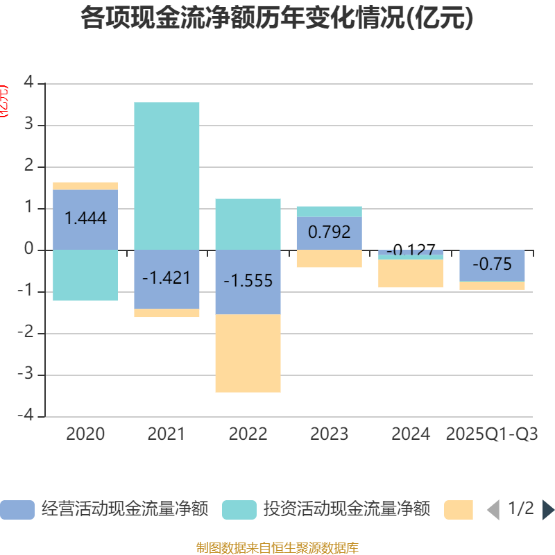 2025年前三季度,公司经营活动现金流净额为-7503.57万元,同比增加1934.41万元;筹资活动现金流净额-1975.88万元,同比增加4041.47万元;投资活动现金流净额-174.53万元,上年同期为-1405.53万元。