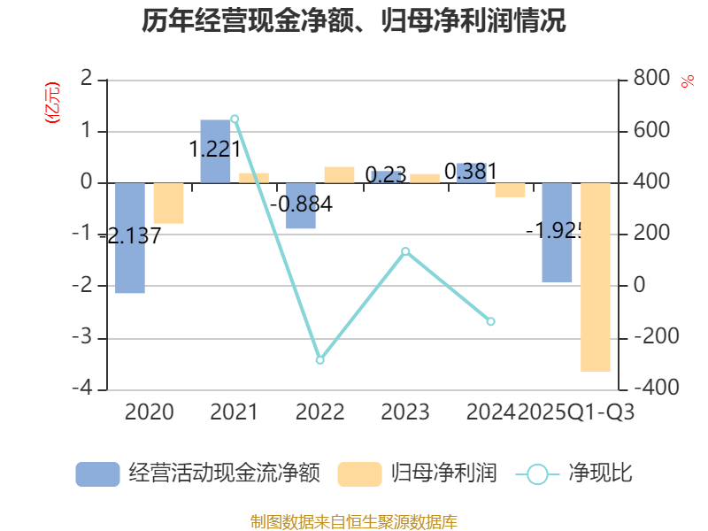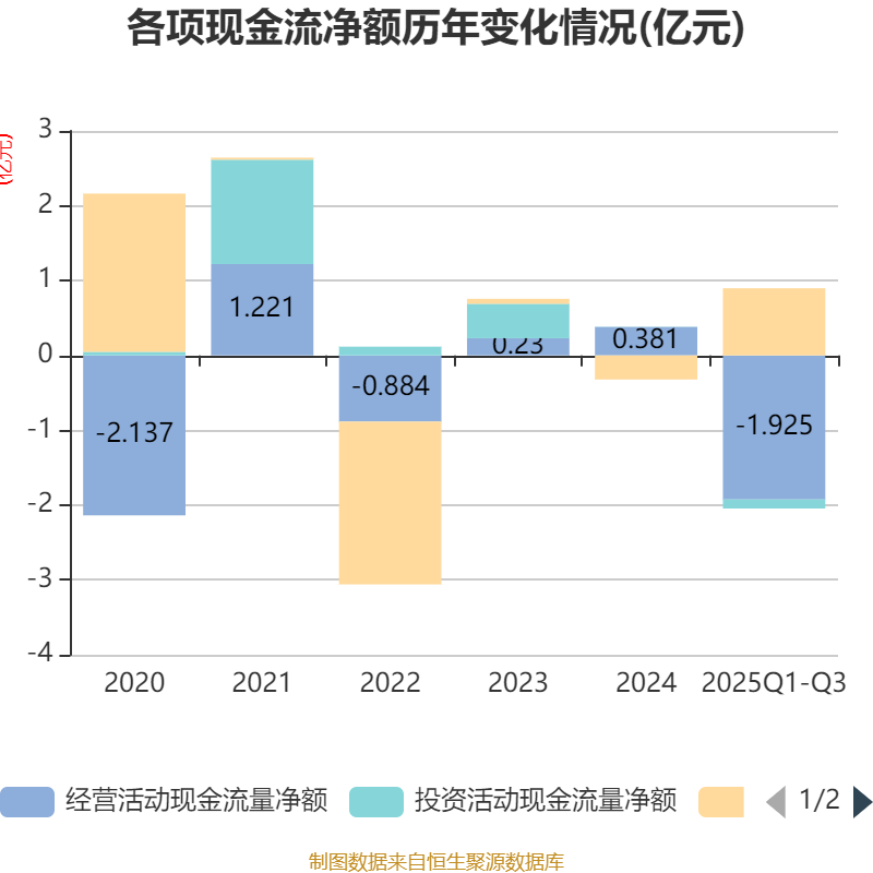 2025年前三季度,公司经营活动现金流净额为-1.92亿元,同比减少1.2亿元;筹资活动现金流净额8983.09万元,同比增加1.03亿元;投资活动现金流净额-1206.4万元,上年同期为34.49万元。