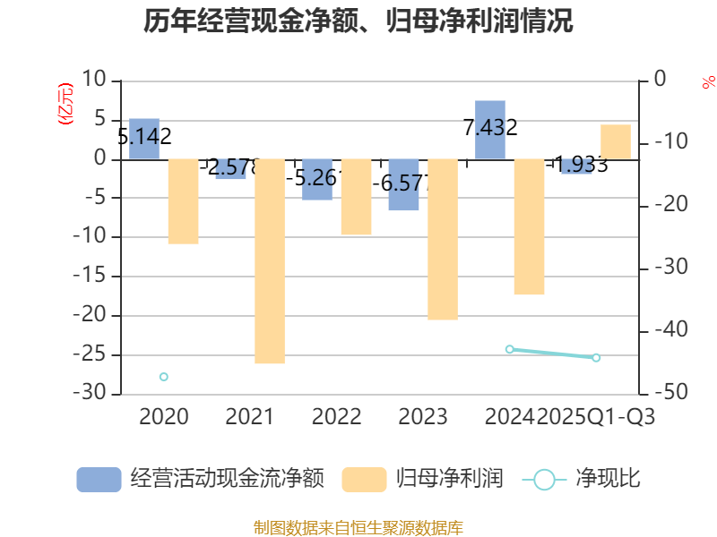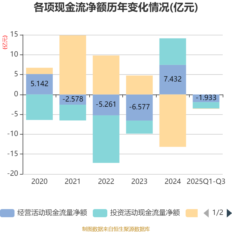 2025年前三季度,公司经营活动现金流净额为-1.93亿元,同比减少5.27亿元;筹资活动现金流净额-901.88万元,同比增加11.11亿元;投资活动现金流净额-1.58亿元,上年同期为7.81亿元。