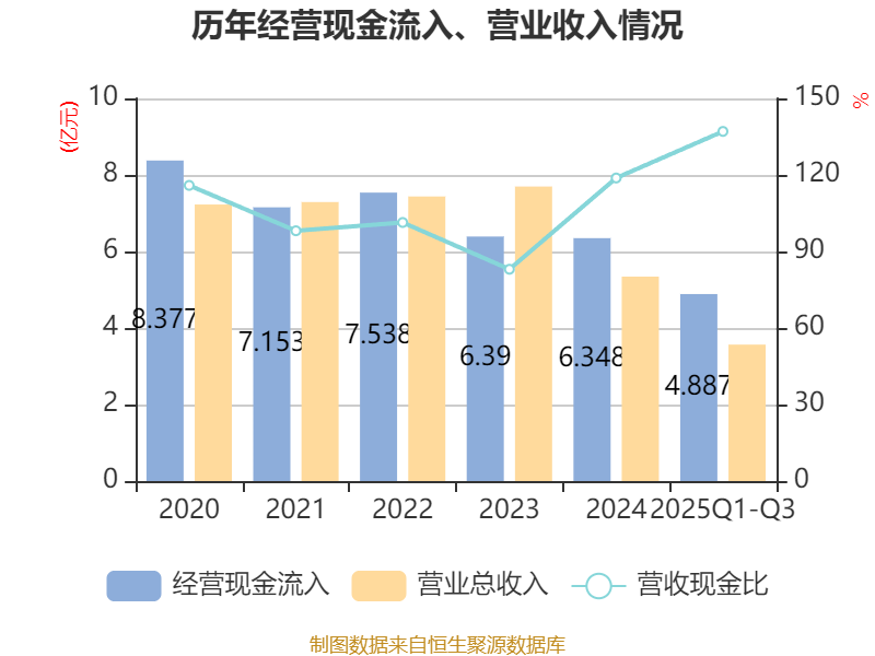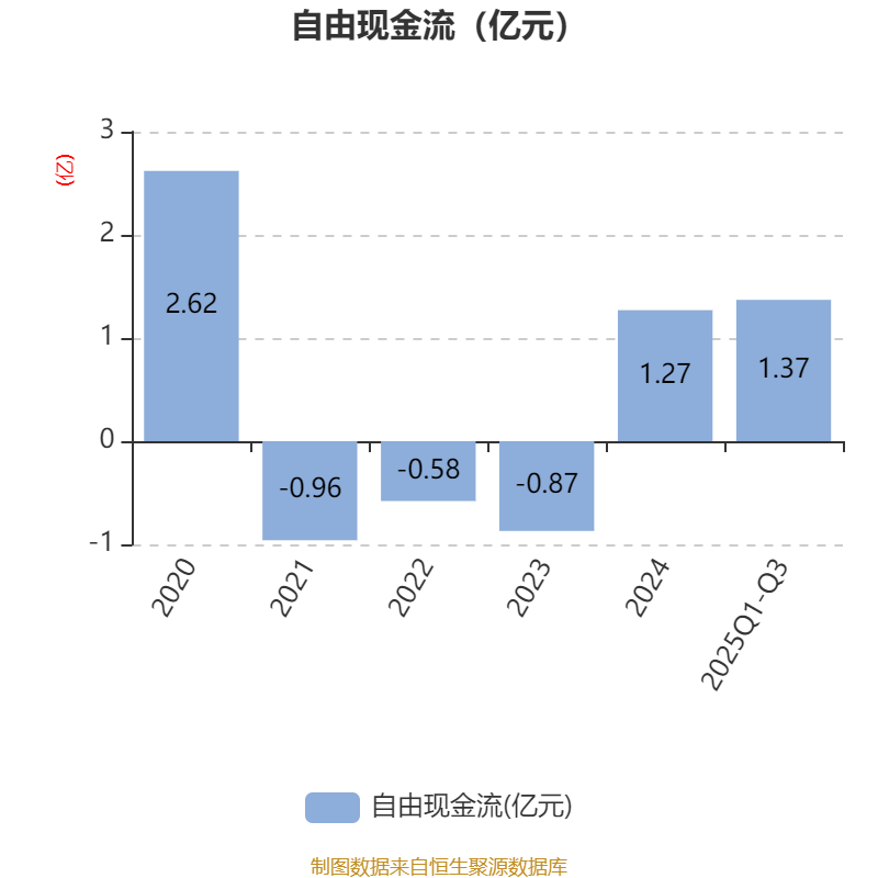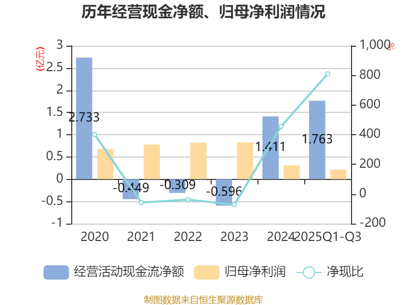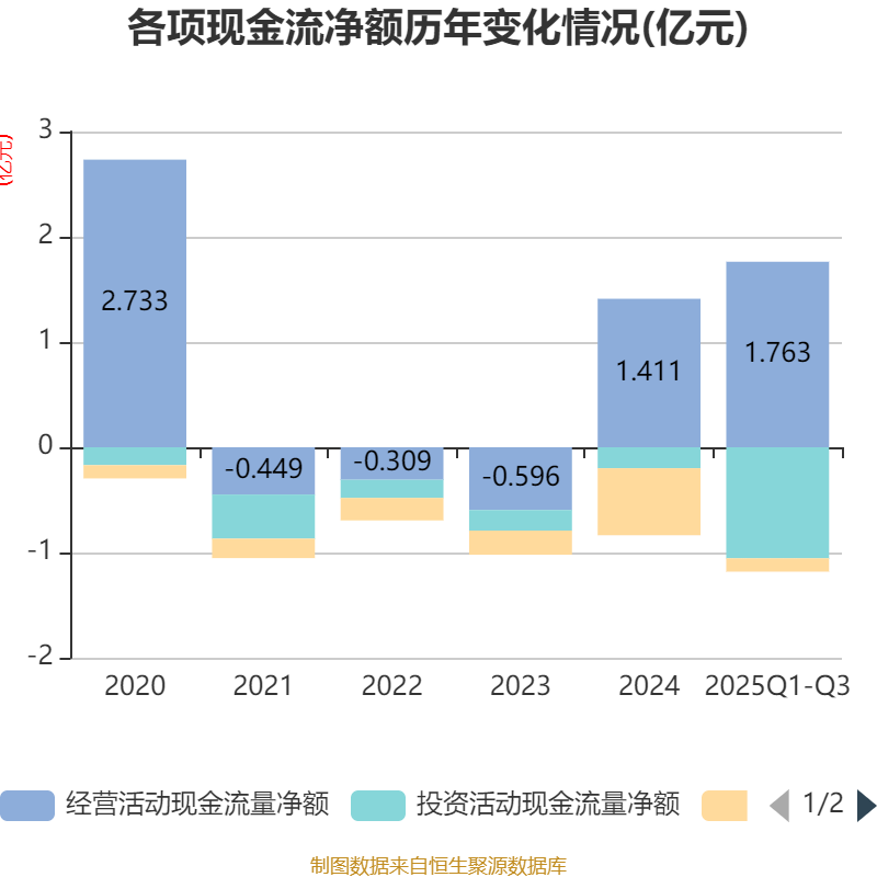 2025年前三季度,公司经营活动现金流净额为1.76亿元,同比下降19.07%;筹资活动现金流净额-1271.71万元,同比增加5094万元;投资活动现金流净额-1.06亿元,上年同期为-1026.09万元。