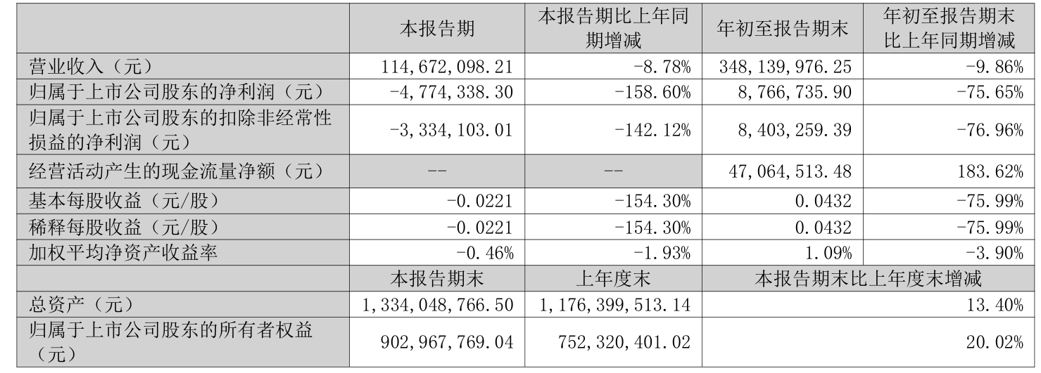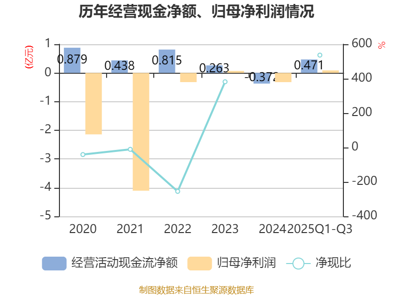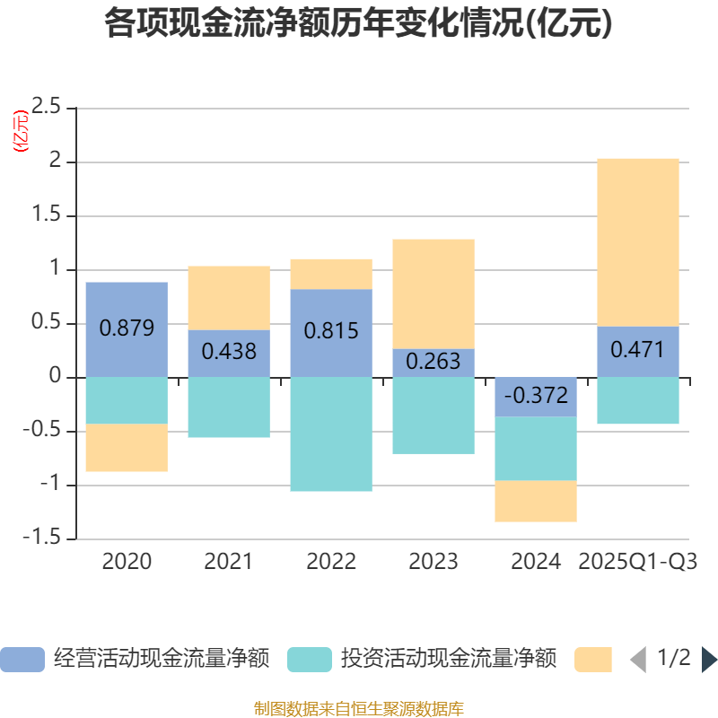 2025年前三季度,公司经营活动现金流净额为4706.45万元,同比增加1.03亿元;筹资活动现金流净额1.56亿元,同比增加2.3亿元;投资活动现金流净额-4350.88万元,上年同期为-1342.92万元。