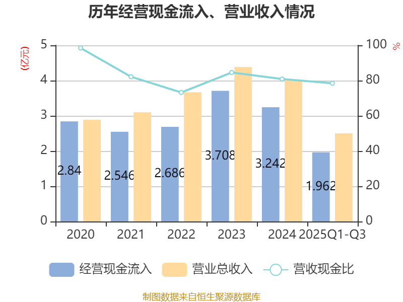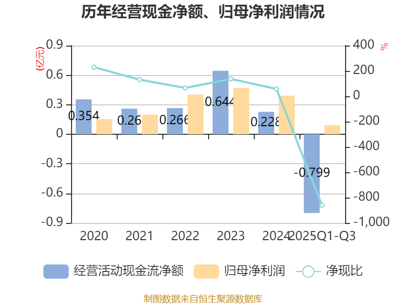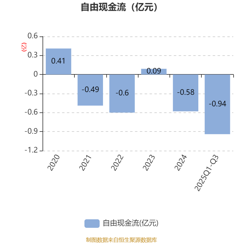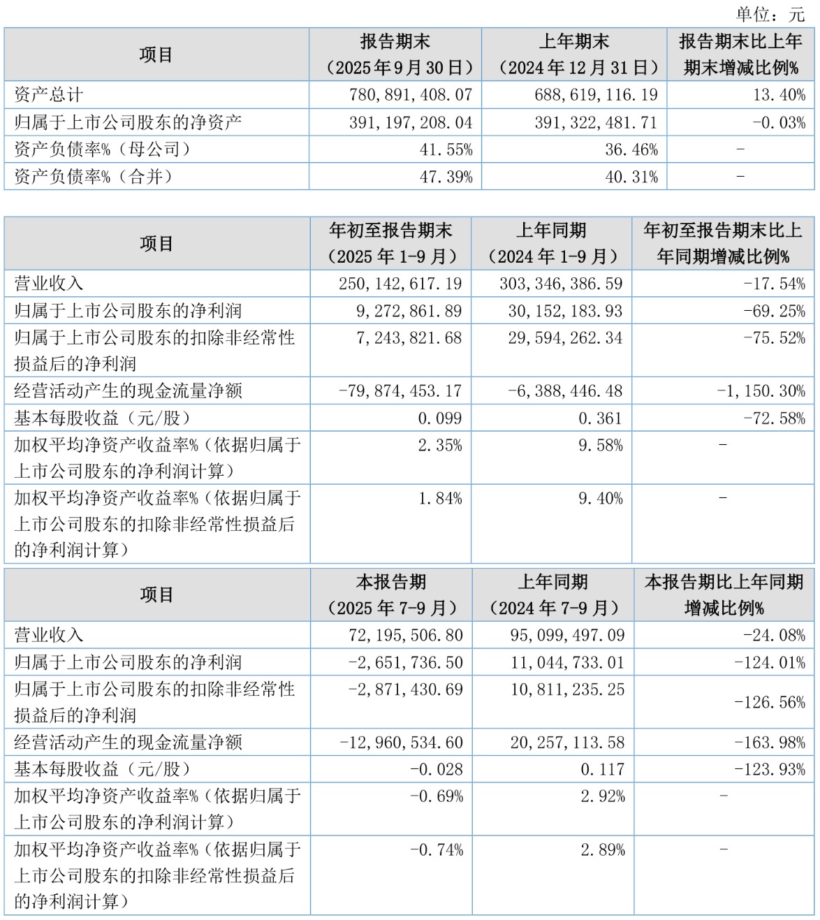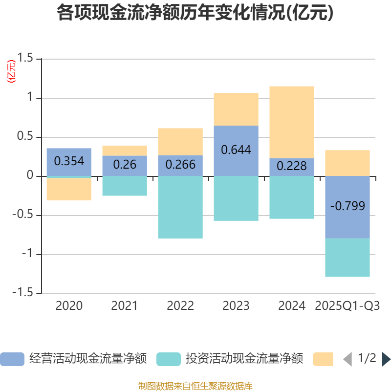 2025年前三季度,公司经营活动现金流净额为-7987.45万元,同比减少7348.6万元;筹资活动现金流净额3301.38万元,同比减少7701.18万元;投资活动现金流净额-4914.02万元,上年同期为-3742.27万元。