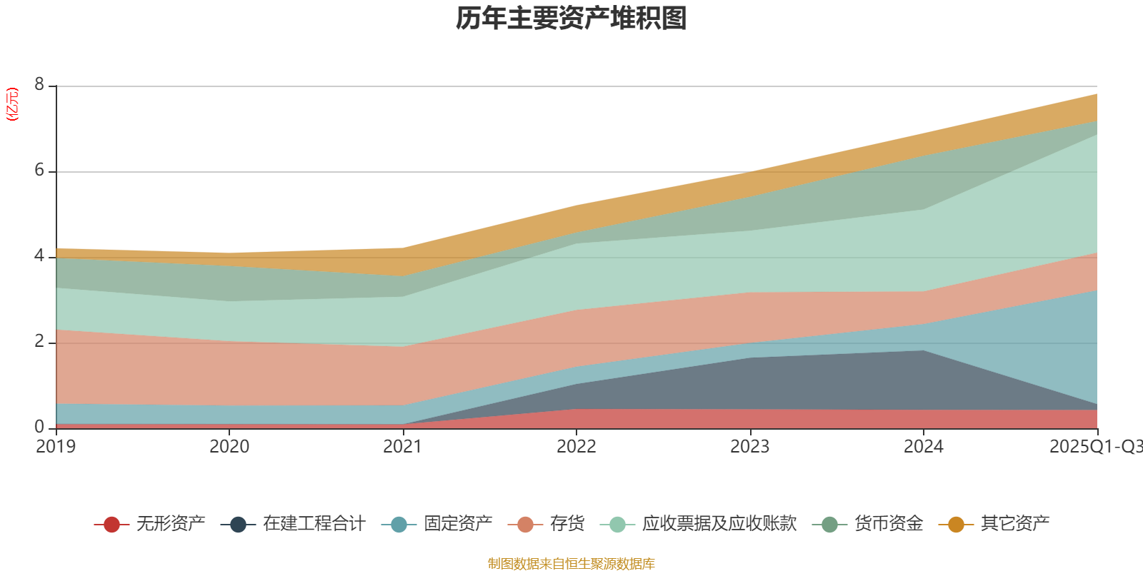 资产重大变化方面,截至2025年三季度末,公司固定资产较上年末增加331%,占公司总资产比重上升25.08个百分点;在建工程合计较上年末减少90.27%,占公司总资产比重下降18.39个百分点;货币资金较上年末减少74.57%,占公司总资产比重下降14.14个百分点;应收票据及应收账款较上年末增加44.1%,占公司总资产比重上升7.52个百分点。