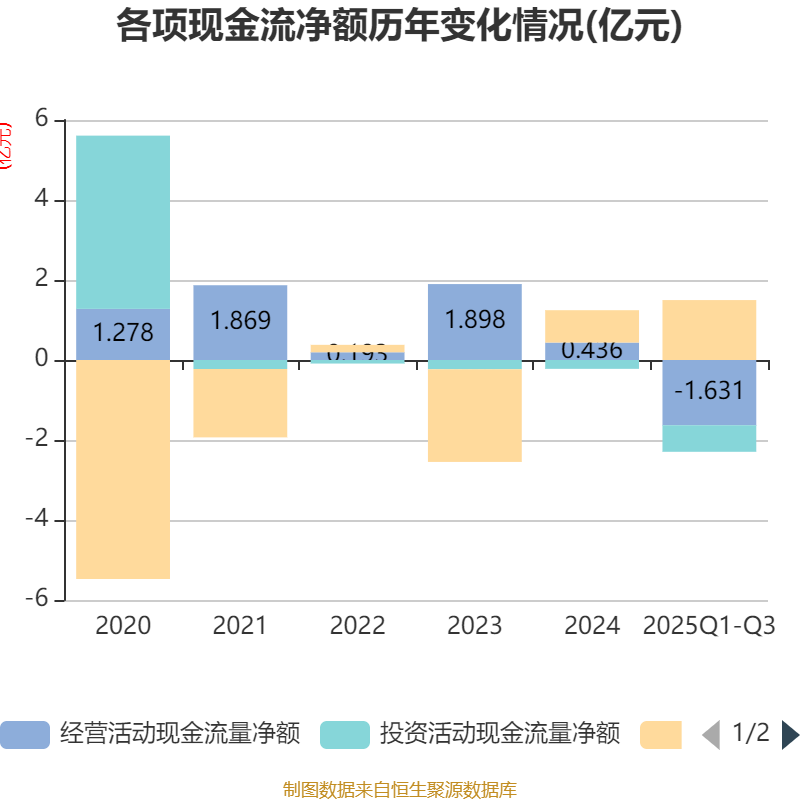 2025年前三季度,公司经营活动现金流净额为-1.63亿元,同比减少1.46亿元;筹资活动现金流净额1.5亿元,同比增加6271.33万元;投资活动现金流净额-6637.22万元,上年同期为-268.42万元。