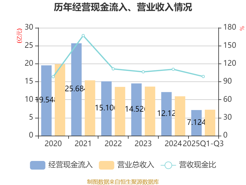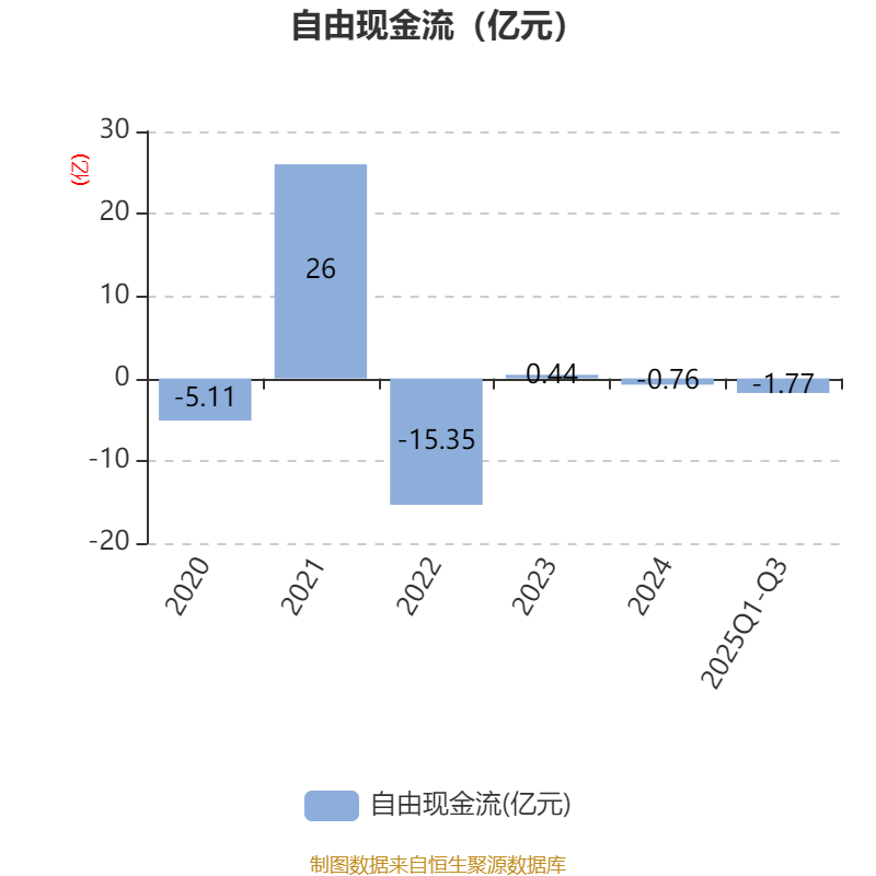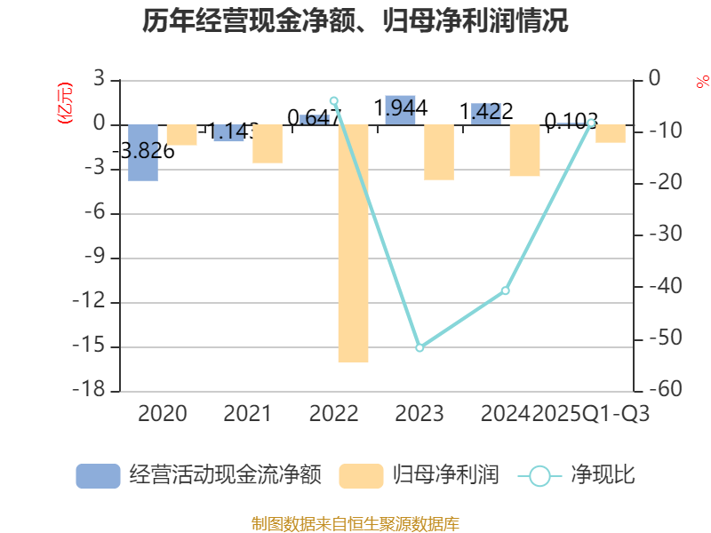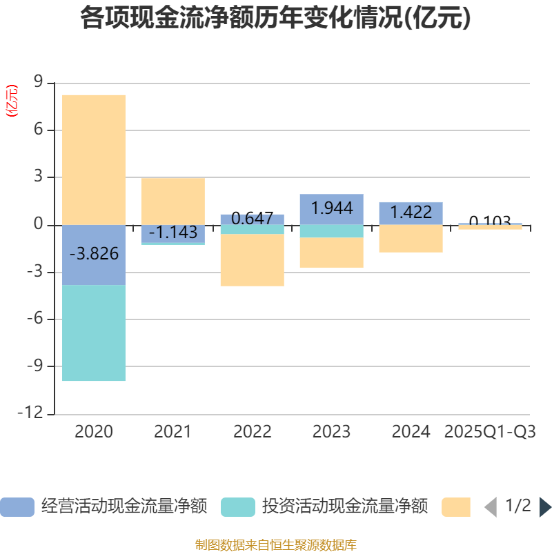 2025年前三季度,公司经营活动现金流净额为1026.43万元,同比下降88.48%;筹资活动现金流净额-2913.1万元,同比增加1.04亿元;投资活动现金流净额-103.58万元,上年同期为498.71万元。