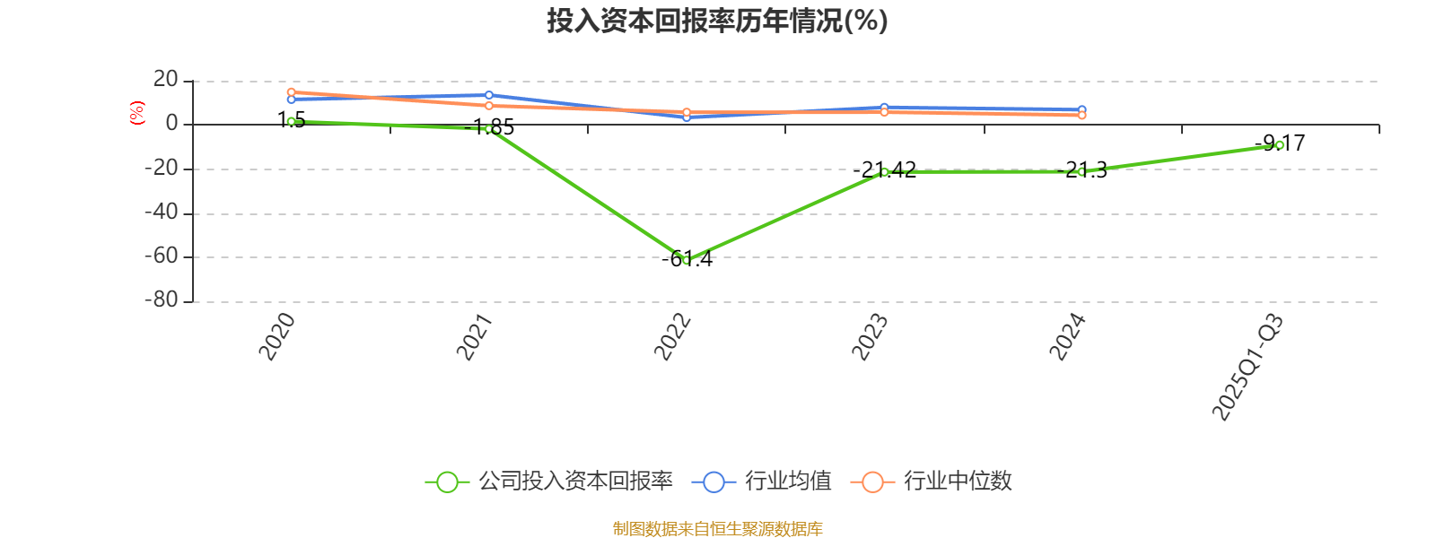 公司2025年前三季度投入资本回报率为-9.17%,较上年同期下降7.18个百分点。