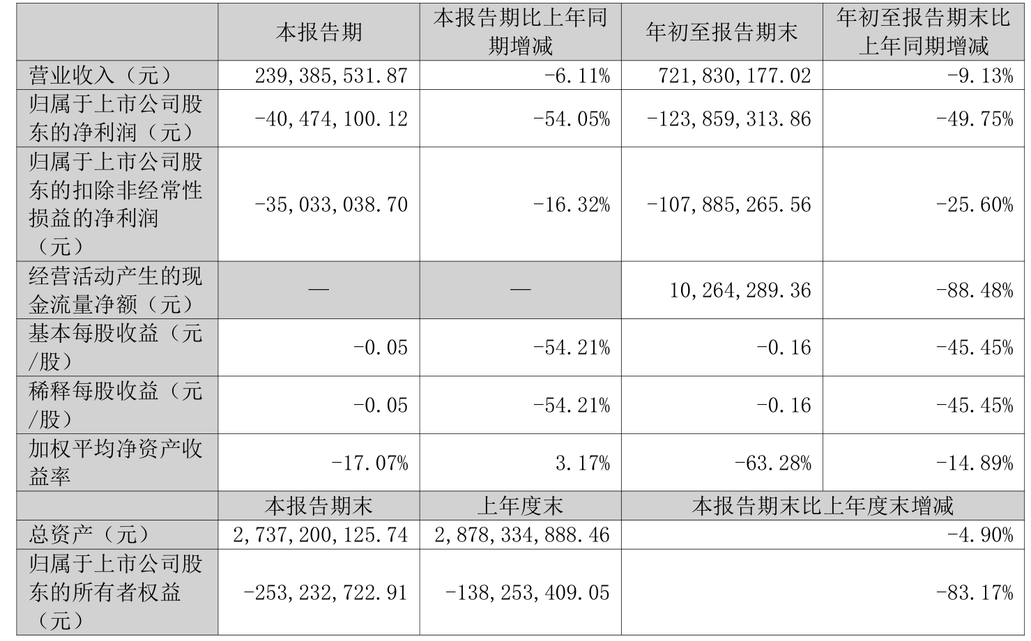 中证智能财讯 *ST美谷(000615)10月29日披露2025年第三季度报告。前三季度公司实现营业总收入7.22亿元,同比下降9.13%;归母净利润亏损1.24亿元,上年同期亏损8271.23万元;扣非净利润亏损1.08亿元,上年同期亏损8589.31万元;经营活动产生的现金流量净额为1026.43万元,同比下降88.48%;报告期内,*ST美谷基本每股收益为-0.16元。