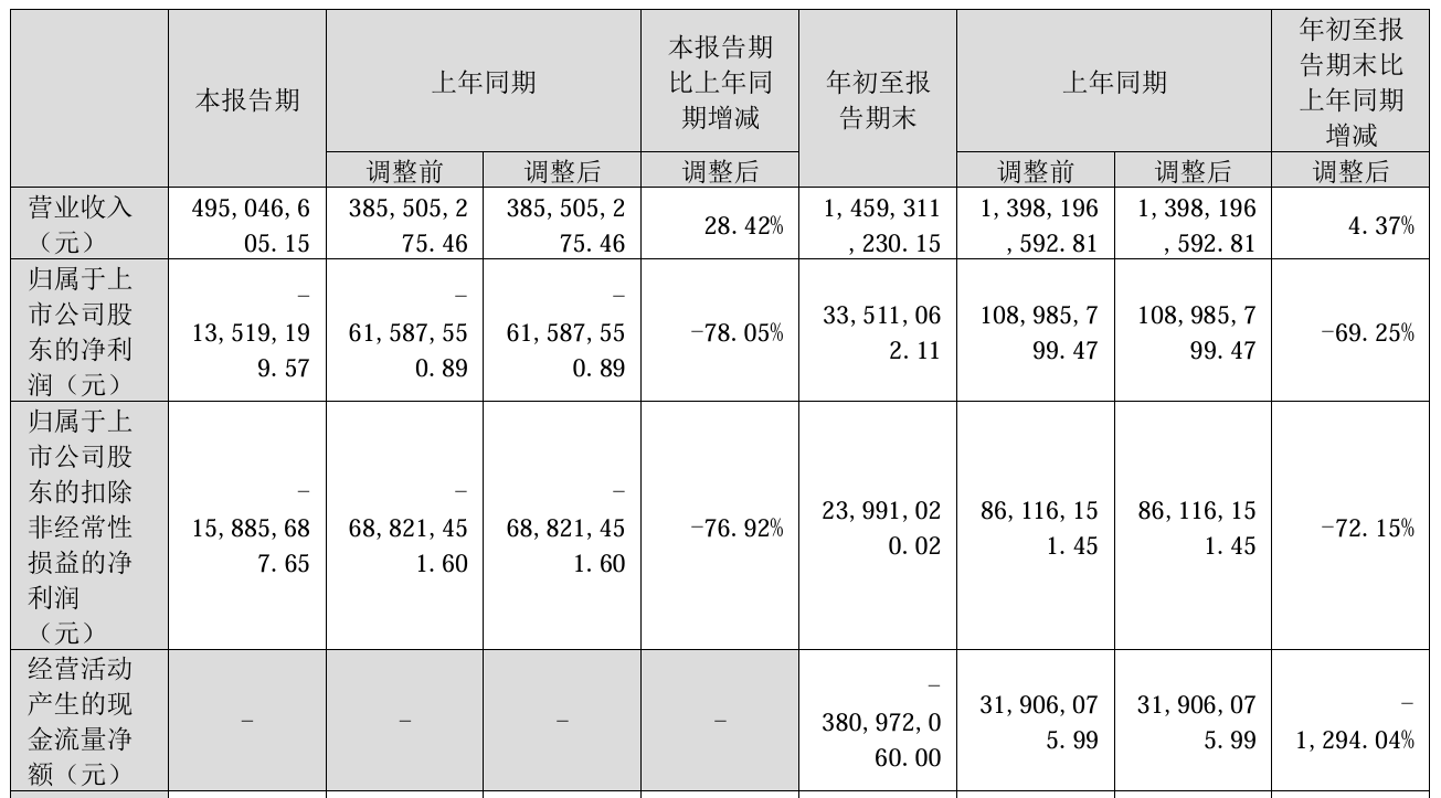公司前三季度经营活动产生的现金流量净额为-3.80亿元,较上年同期减少4.13亿元,降幅为1294.04%,主要系本期采购商品支付的金额增加所致。