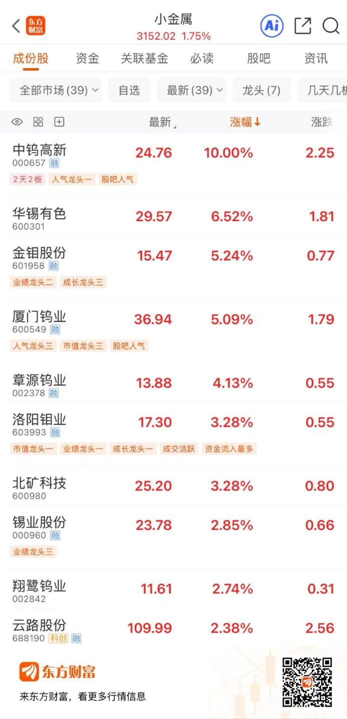 10月29日,A股小金属板块集体走强,钨方向领涨。截至发稿,中钨高新涨停,股价已2连板;厦门钨业涨超5%,股价创历史新高;章源钨业涨超4%,股价已8连阳;翔鹭钨业涨超2%,股价同样报8连阳。