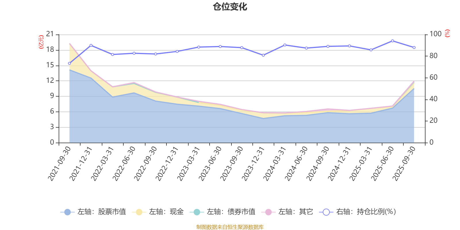 据定期报告数据统计,近三年平均股票仓位为87.88%,同类平均为88.27%。2025年上半年末基金达到94.13%的最高仓位,2021年三季度末最低,为73.36%。