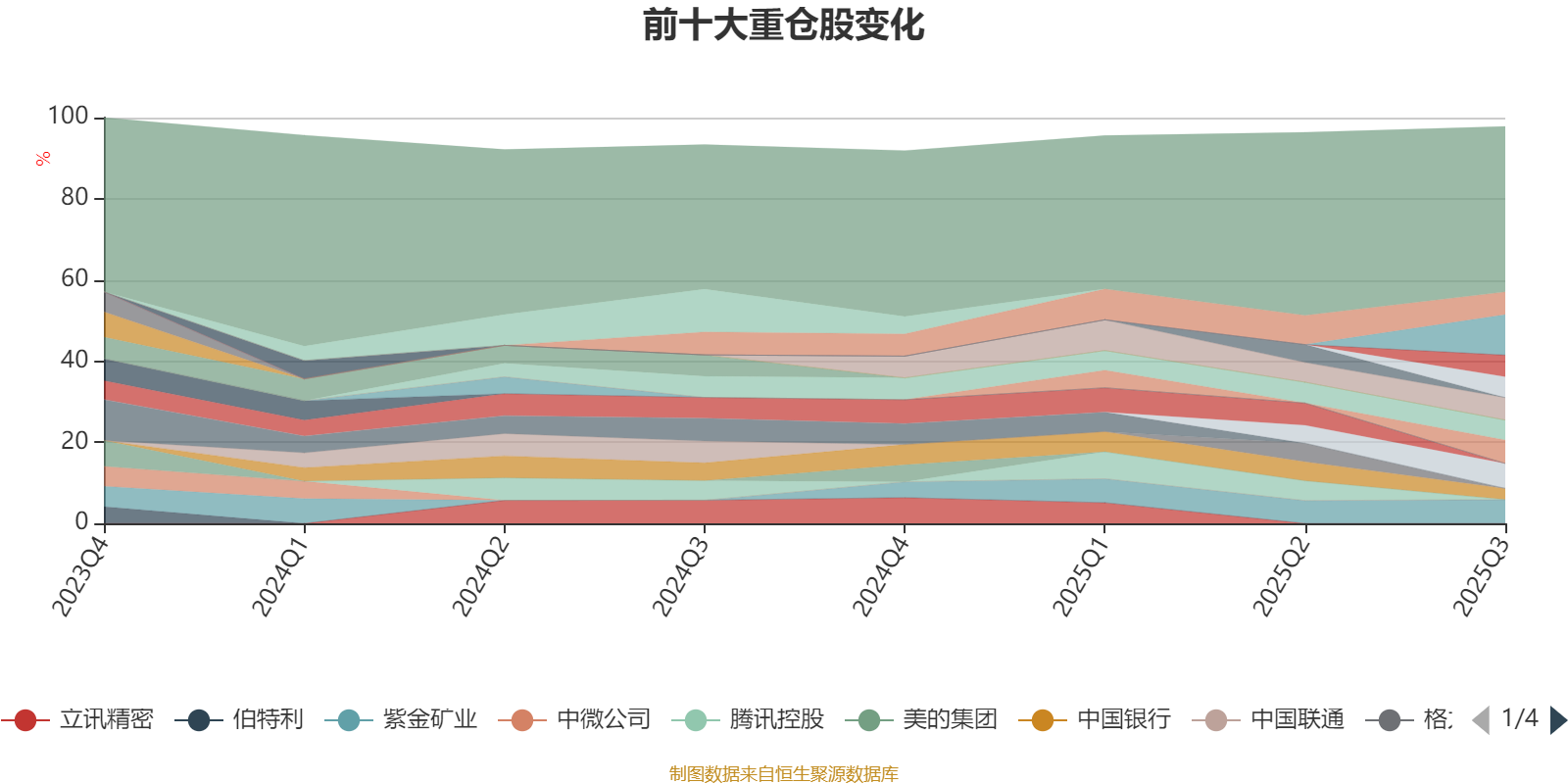 截至2025年三季度末,基金十大重仓股分别是新易盛、兆易创新、紫金矿业、同花顺、中国宏桥、中芯国际、华虹半导体、巨化股份、中国石油、中国银行。