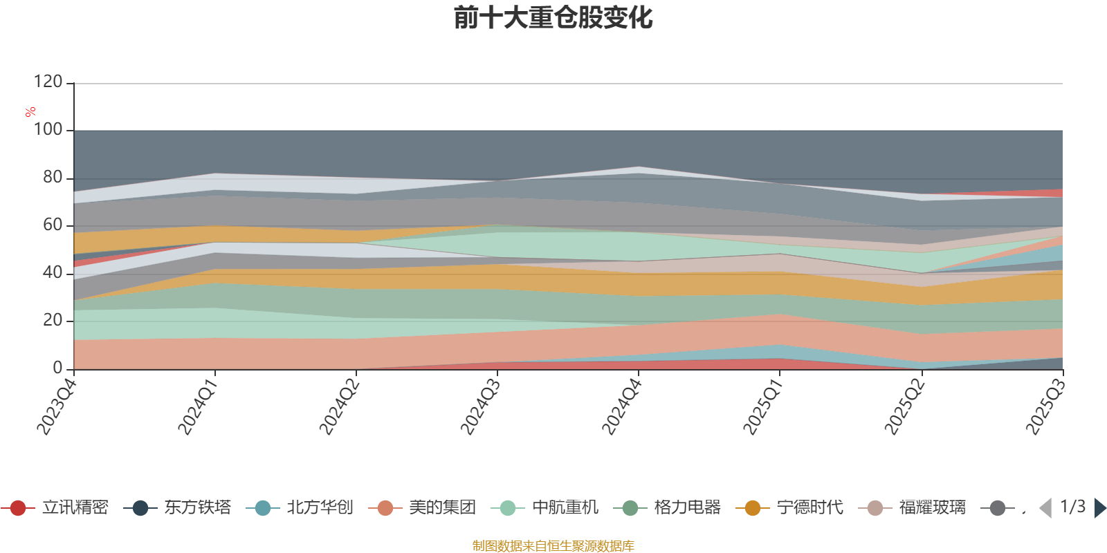该基金持股集中度较高,近2年前十大重仓股集中度长期超过60%。截至2025年三季度末,基金十大重仓股分别是宁德时代、海尔智家、格力电器、美的集团、亚钾国际、东方铁塔、徐工机械、松井股份、山推股份、亿纬锂能。