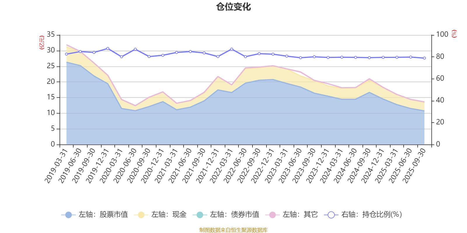 据定期报告数据统计,近三年平均股票仓位为79.87%,同类平均为88.58%。2019年末基金达到87.7%的最高仓位,2025年三季度末最低,为78.9%。