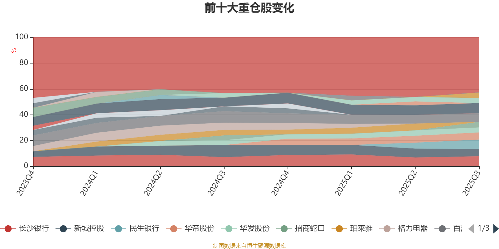 该基金持股集中度较高。截至2025年三季度末,基金十大重仓股分别是长沙银行、常熟银行、民生银行、百润股份、华帝股份、新城控股、齐鲁银行、招商蛇口、保利发展、华发股份。