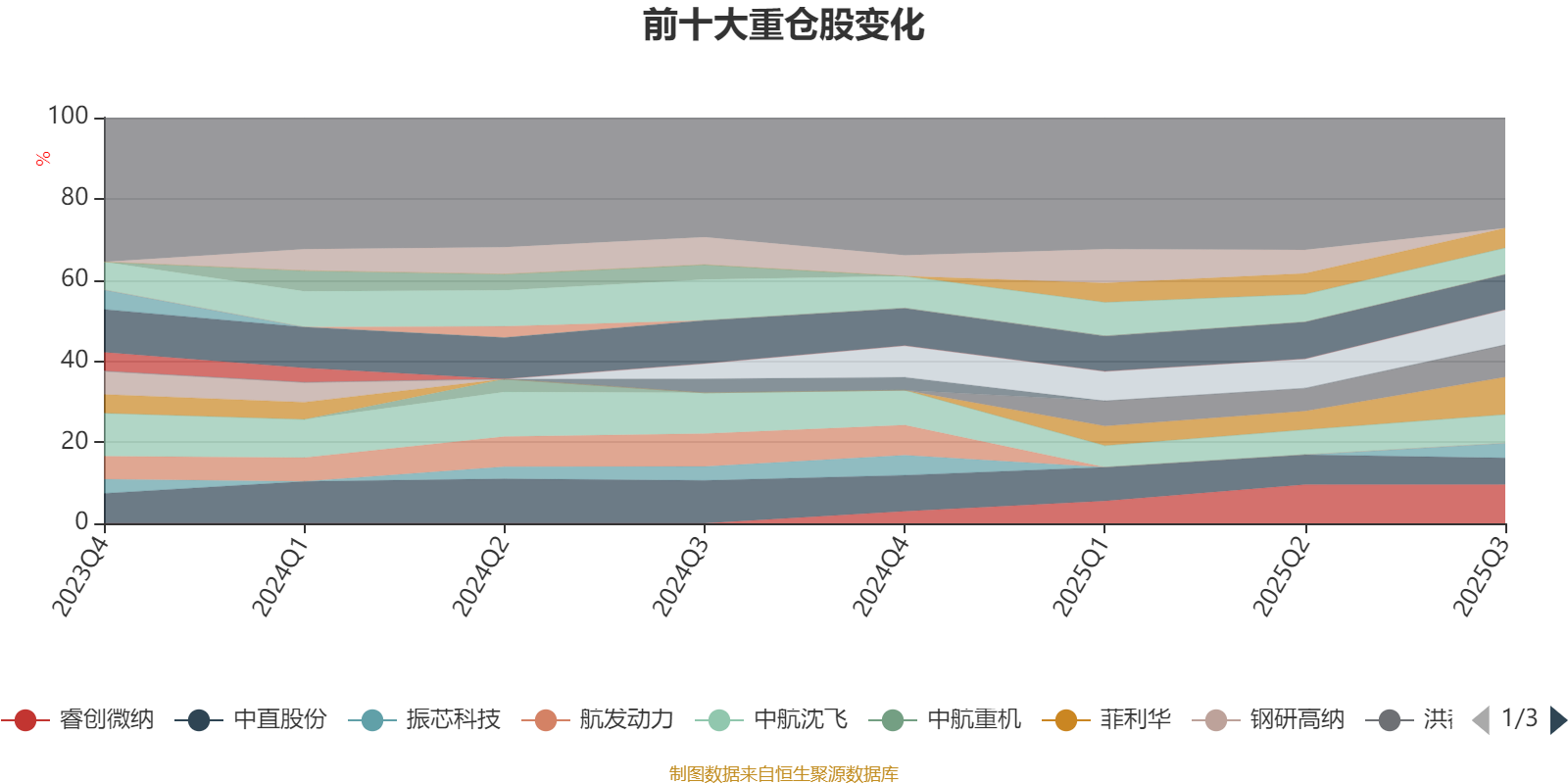 该基金持股集中度较高,近2年前十大重仓股集中度长期超过60%。截至2025年三季度末,基金十大重仓股分别是睿创微纳、菲利华、湘电股份、寒武纪、洪都航空、中航沈飞、中科星图、中直股份、高德红外、振芯科技。