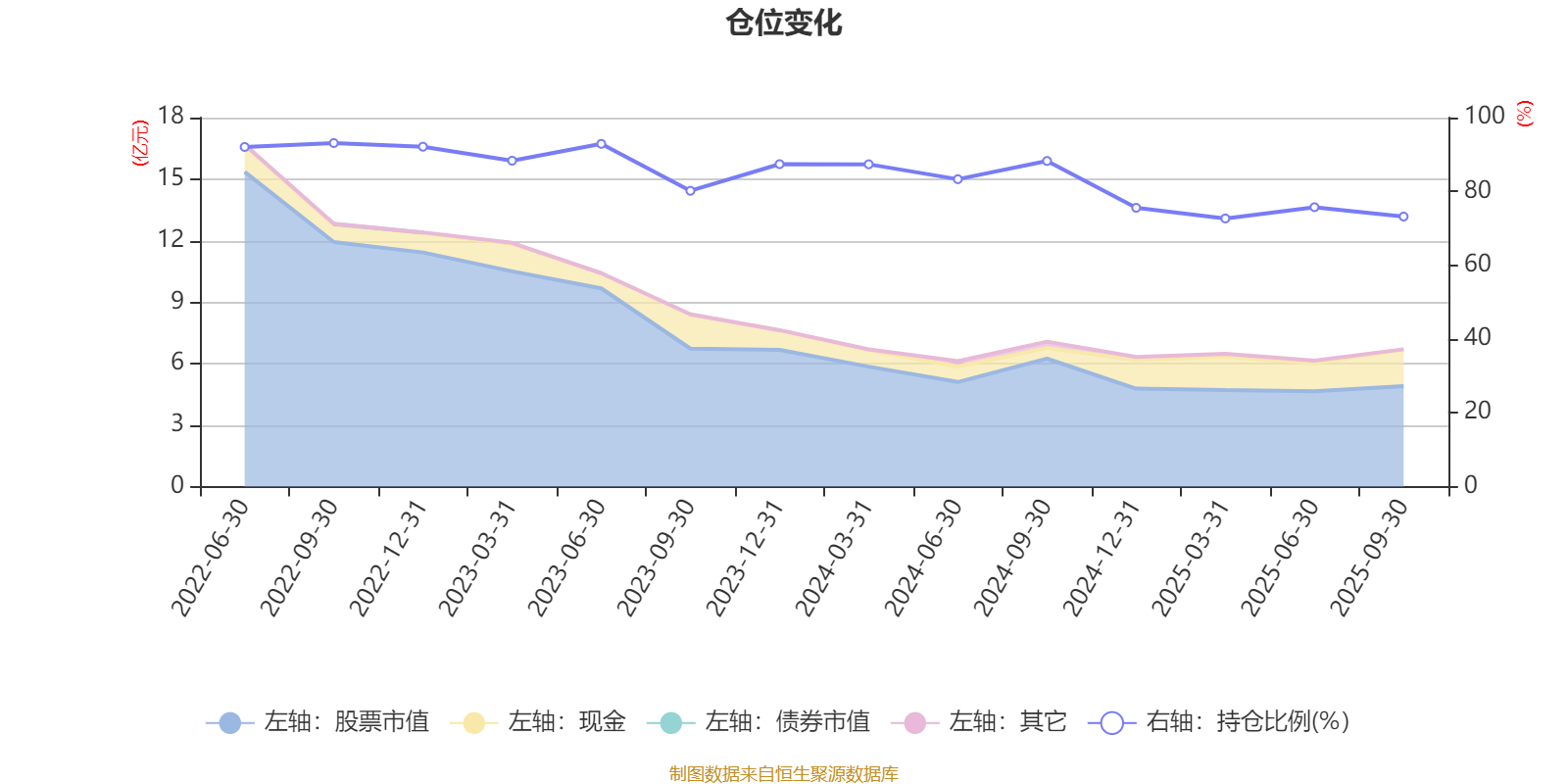 据定期报告数据统计,近三年平均股票仓位为83.07%,同类平均为72.35%。2022年三季度末基金达到93.1%的最高仓位,2025年一季度末最低,为72.67%。