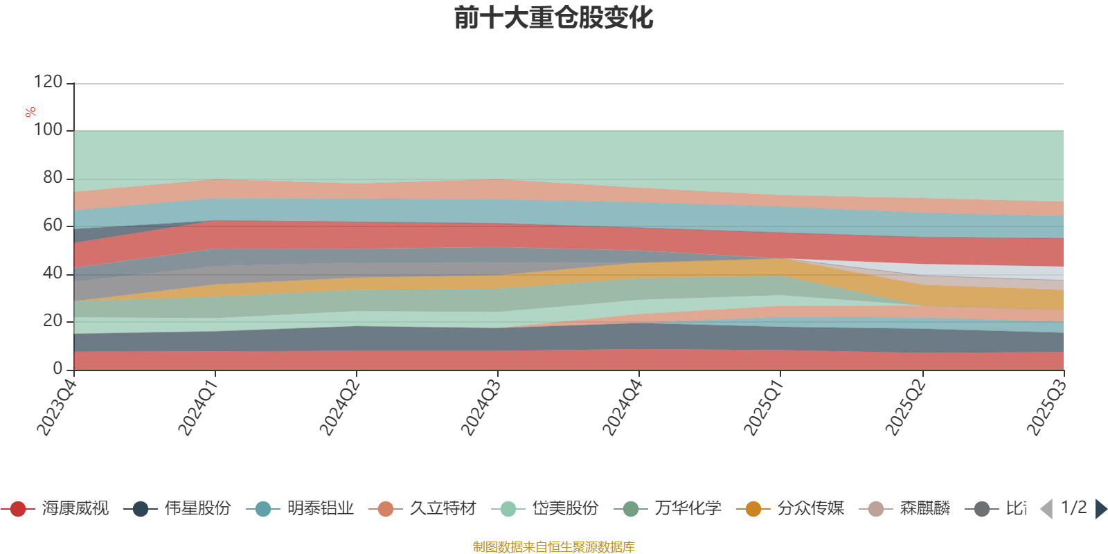 该基金持股集中度较高,近2年前十大重仓股集中度长期超过60%。截至2025年三季度末,基金十大重仓股分别是紫金矿业、美的集团、分众传媒、伟星股份、海康威视、继峰股份、杰克科技、久立特材、明泰铝业、森麒麟。