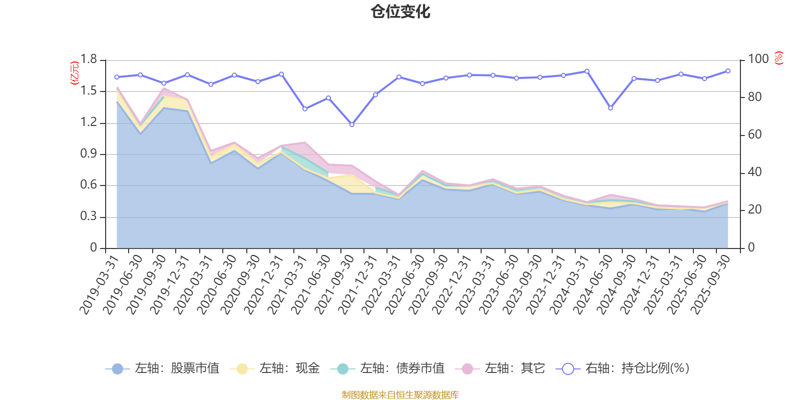 据定期报告数据统计,近三年平均股票仓位为90.14%,同类平均为72.35%。2025年三季度末基金达到94.21%的最高仓位,2021年三季度末最低,为65.7%。